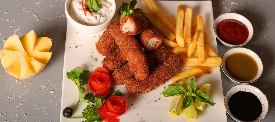 Zartes Pouletbrustfilet, gefüllt mit Schinken und feinem Raclette, goldbraun gebacken serviert mit Pommes Frites und frischem Gemüse (Zucchini, Karotten, Peperoni, rote Zwiebeln ) Ein beliebter Klassiker, der immer schmeckt