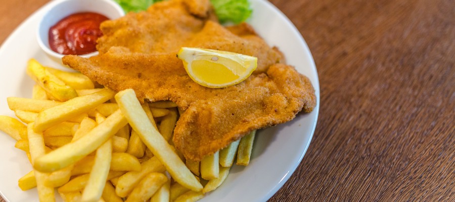 Zartes Schweinefleisch, knusprig paniert und goldgelb gebackenDazu feine Pommes Frites und frischem Gemüse (Zucchini, Karotten, Peperoni, rote Zwiebeln )Ein Klassiker, der immer begeistert